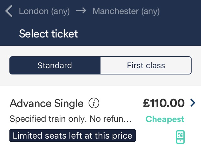 The second trip is to Manchester for a course that I am leading. Now that the delegate list has been finalised, I am able to book my travel. As I would have to leave home before 0630 to get there on time on the day, I am able to book a hotel and travel the night before after work. This puts me into peak travel time, and a single from London to Manchester was £110, and an open return for was £329.