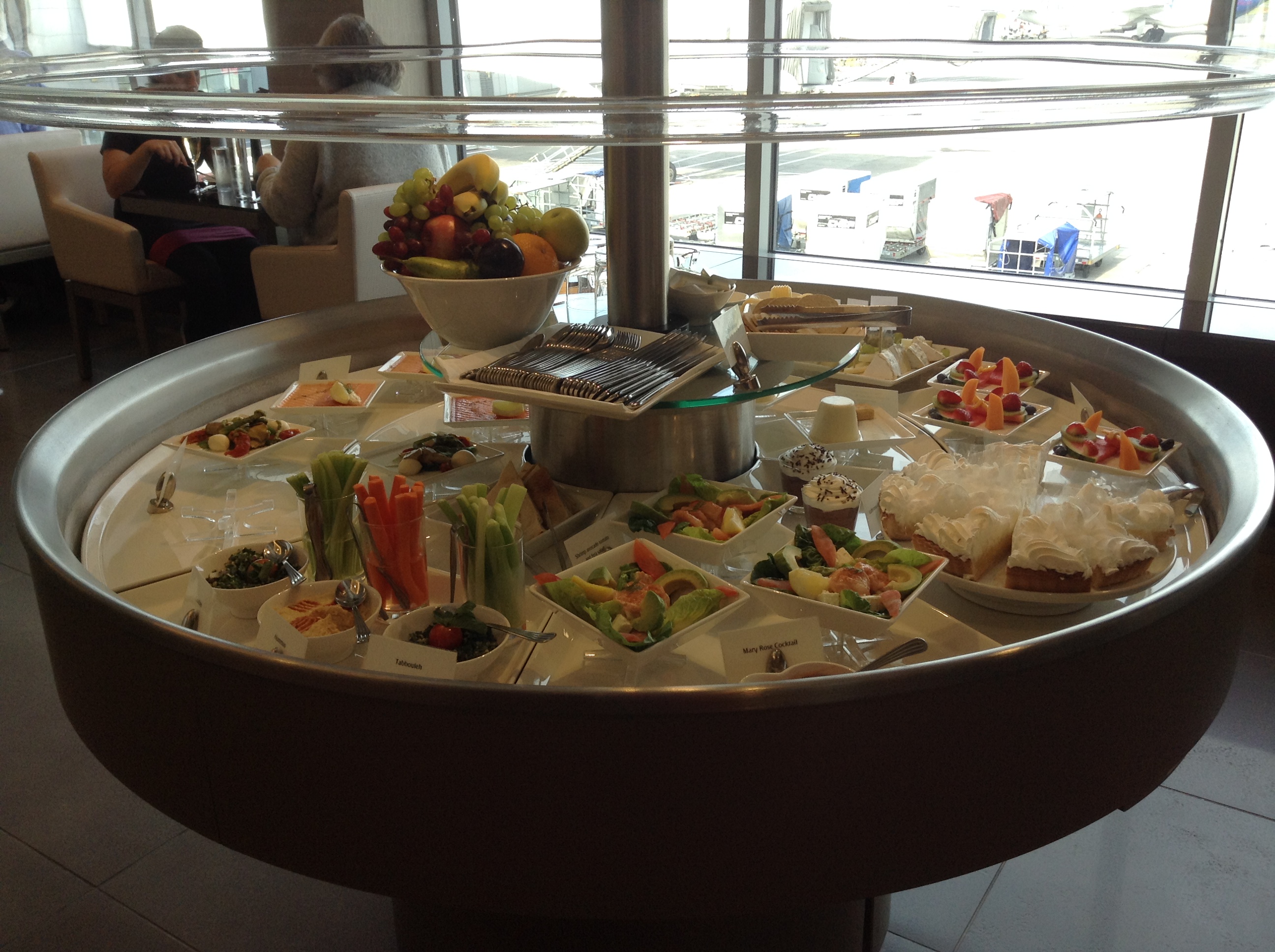 Very pleasant lunch with excellent wine selection; Veuve Clicquot and I am supping a very nice Cloudy Bay! Dad had filet of beef. Rated 9/10! I had salmon and crudités. Selections well topped up at the buffet. Staff were very attentive in clearing up and refilling the stations. Also lots of discrete staff making sure the tables were spotless. They all look very tidy and presentable, and even offered fetch me a wine top up.