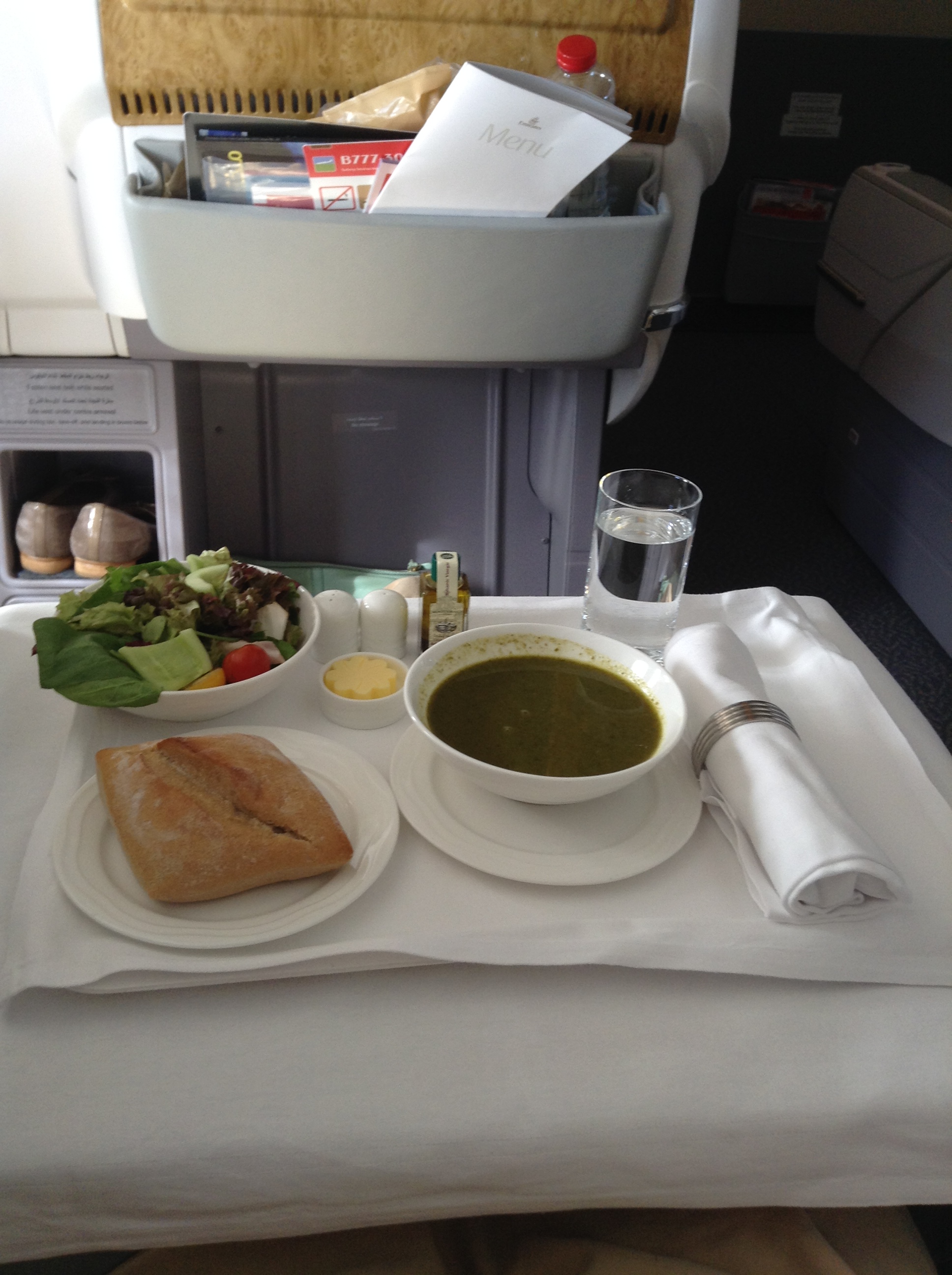 After a 7 hour layover, we headed towards the boarding gate, flashed boarding cards and walked straight onto the plane. Why does this never happen when flying BA? Dad had the venison, and I started with a tasty soup.