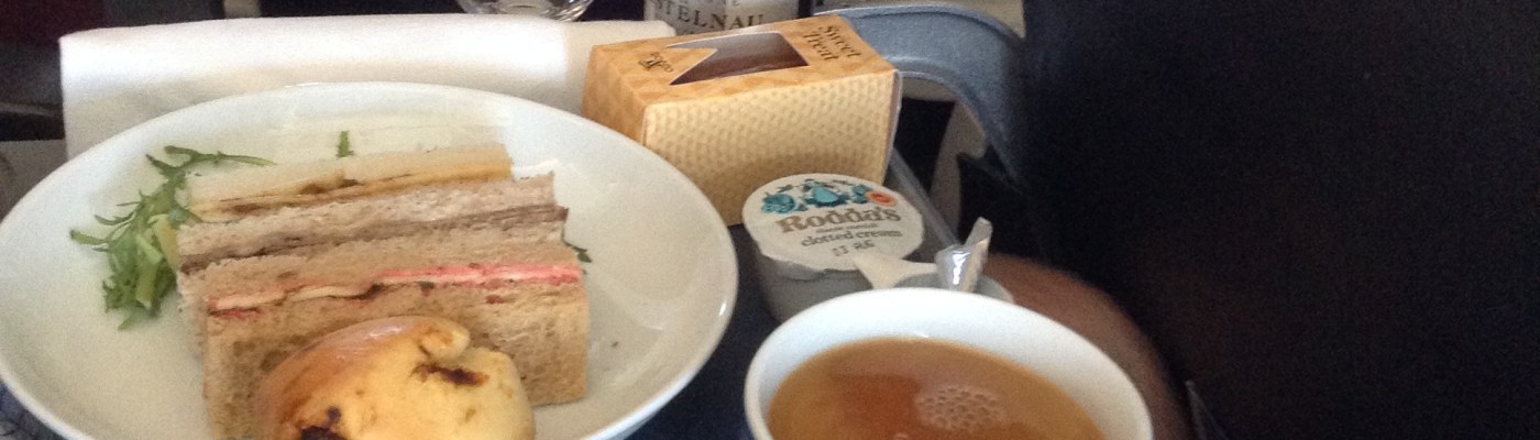 Our next flight was a BA Airbus 319 to LHR. We were in row 2 Club Europe. Not much difference to usual seating, except middle seat had a fancy tray on top and we were served a very nice (and unexpected) afternoon tea with delicate sandwiches, warm scones, clotted cream and jam and a fancy cake thingy! Oh, and MisterAirmiles indulged in Champagne!