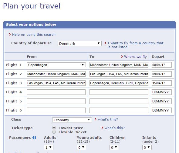 However, I was able to come up with a route that worked on price as well as timings. CPH-LHR-MAN-PHL-LAS-JFK-LHR-CPH for 4206DKK, or £484. I used 35,000 Avios to take off 1787DKK which took the price down to £285 which is an incredible price, considering that the LHR-MAN flights I would need to have bought anyway would be £110.