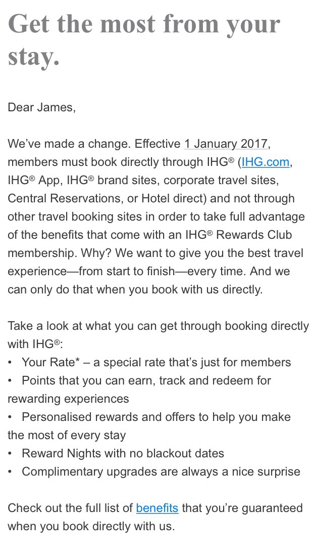 An email popped into my inbox over the weekend from the IHG Reward Club that seems to have caused a bit of a stir in the blogosphere. Headforpoints labelled it “weird” and InsideFlyerUK called it “puzzling“.