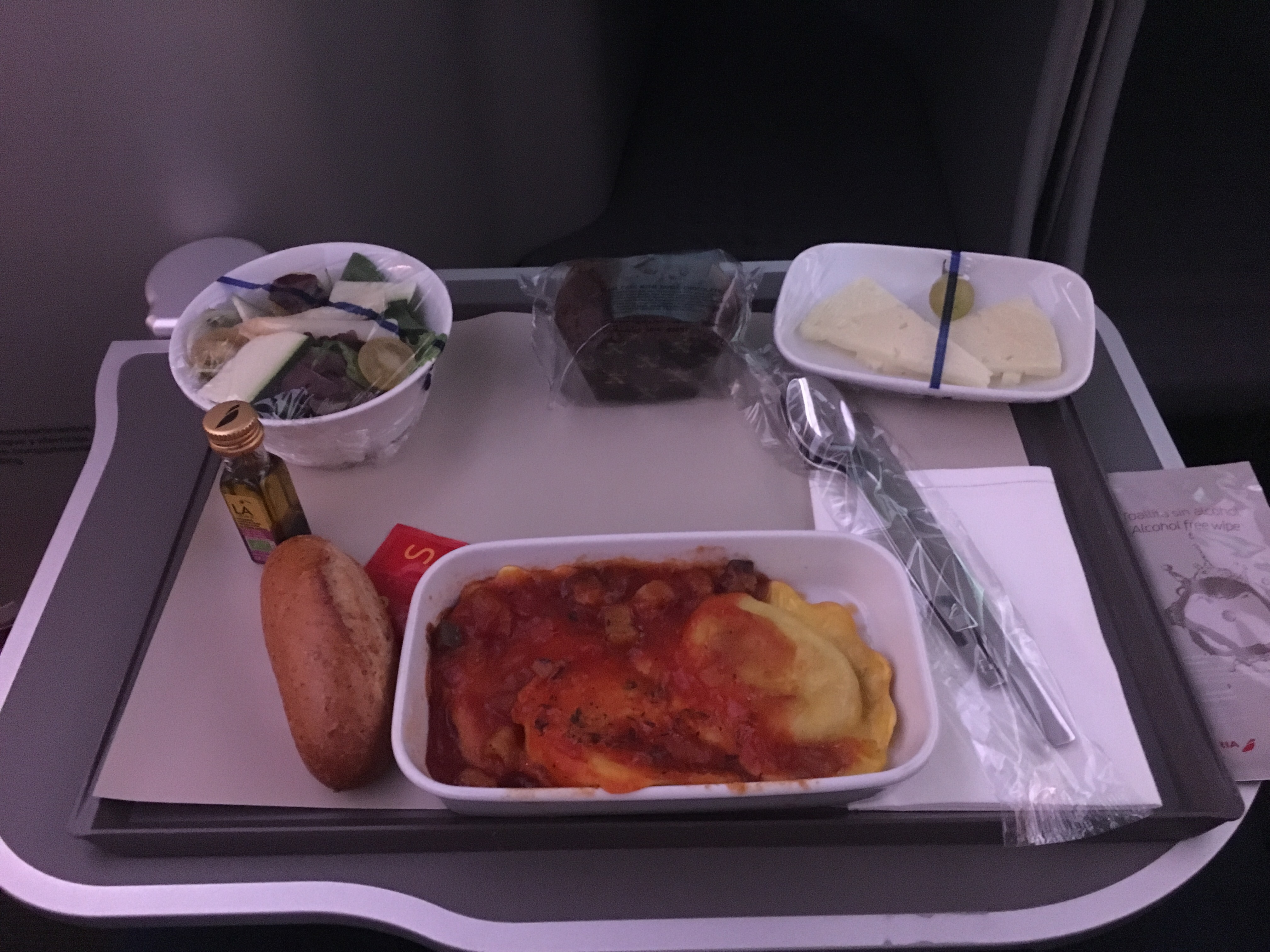 Dinner was soon to follow. We had decided to order one special vegetarian meal and one normal, as I recalled having a really nice salmon pasta on a previous flight. Dinner was served and I chose the cheese pasta.