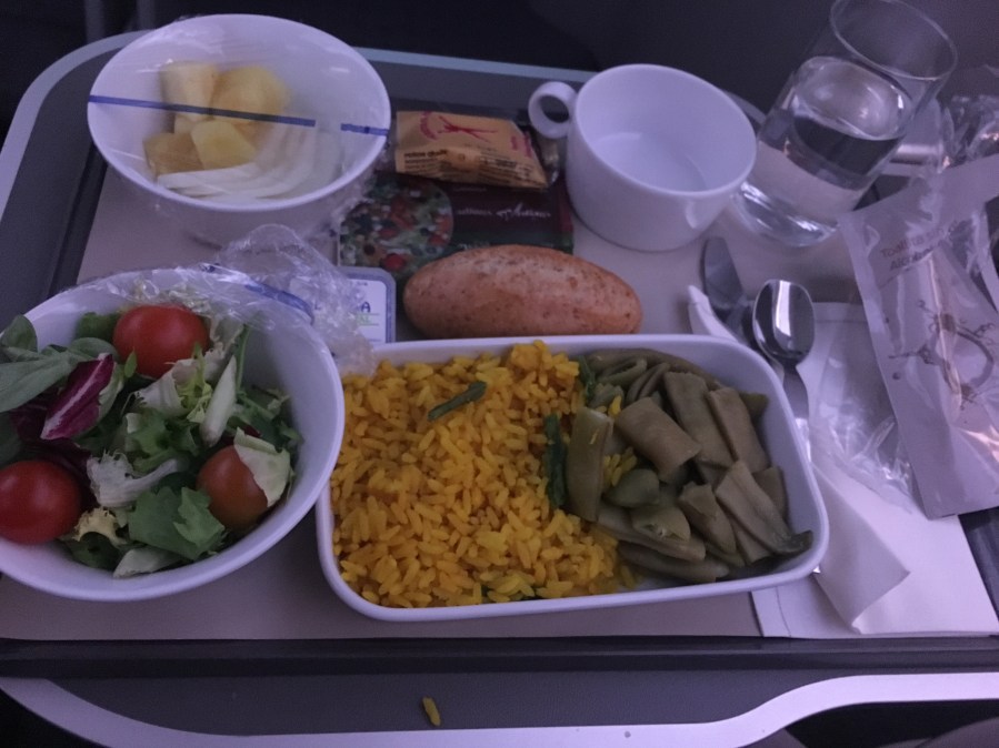 My wife also did the same as we assumed that it would be the vegetarian option. A moment later, another stewardess came and removed her tray, saying that her vegetarian main was on the way. Her original tray had a salad, manchego and cake; the new one had a plainer salad, fruit and no cake – all of it was vegetarian in the first place! The main arrived and it was incredible; literally a plate of rice and green beans. No sauce. No protein. Just rice and green beans. Being the kind of guy I am, I gave her half of mine.