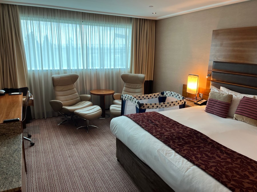 We took the Elizabeth Line from central London, delighted that there was air conditioning and space compared to the Piccadilly Line. We checked in around 3pm, and the room was ready and waiting. The travel cot was set up.