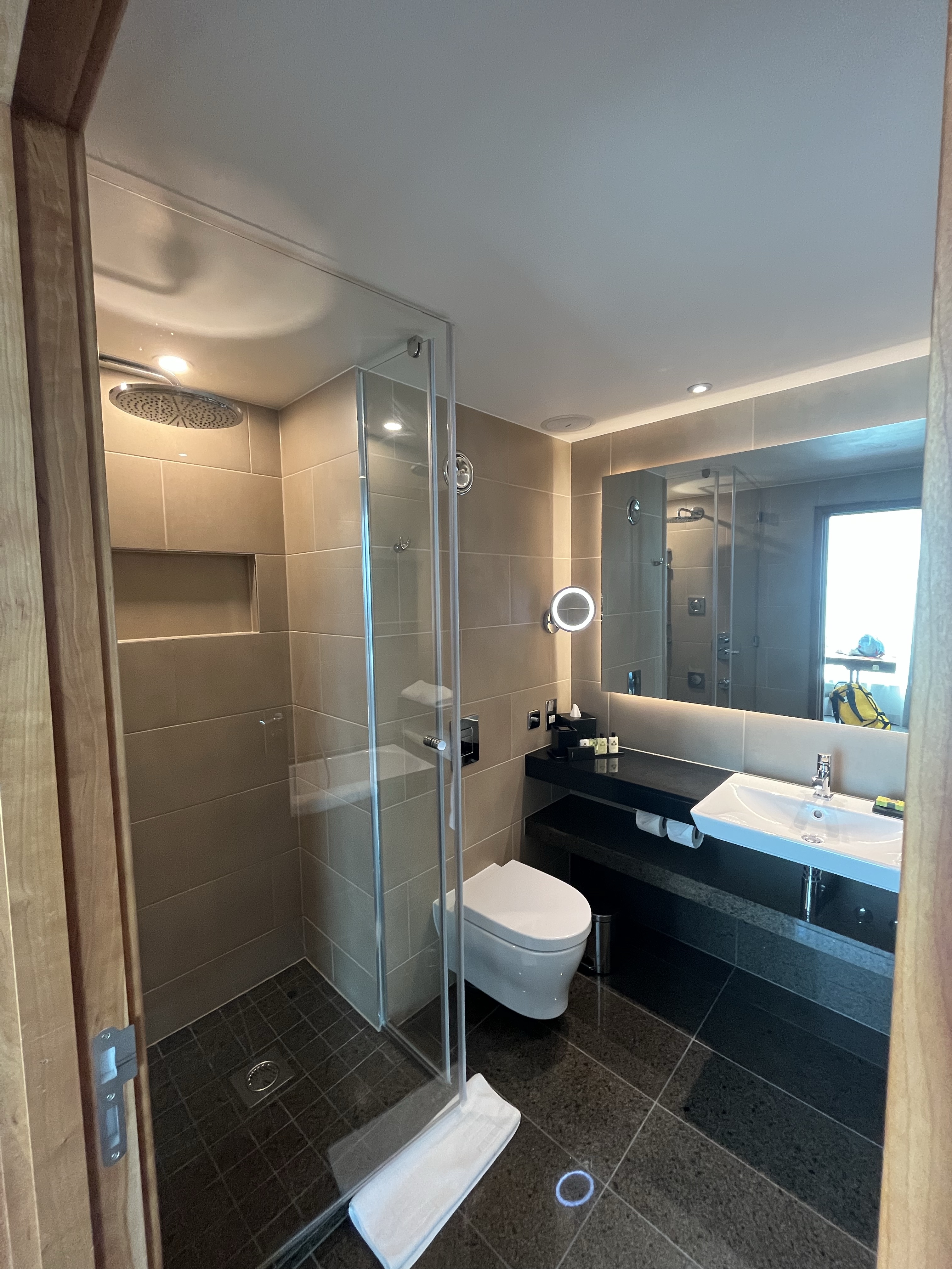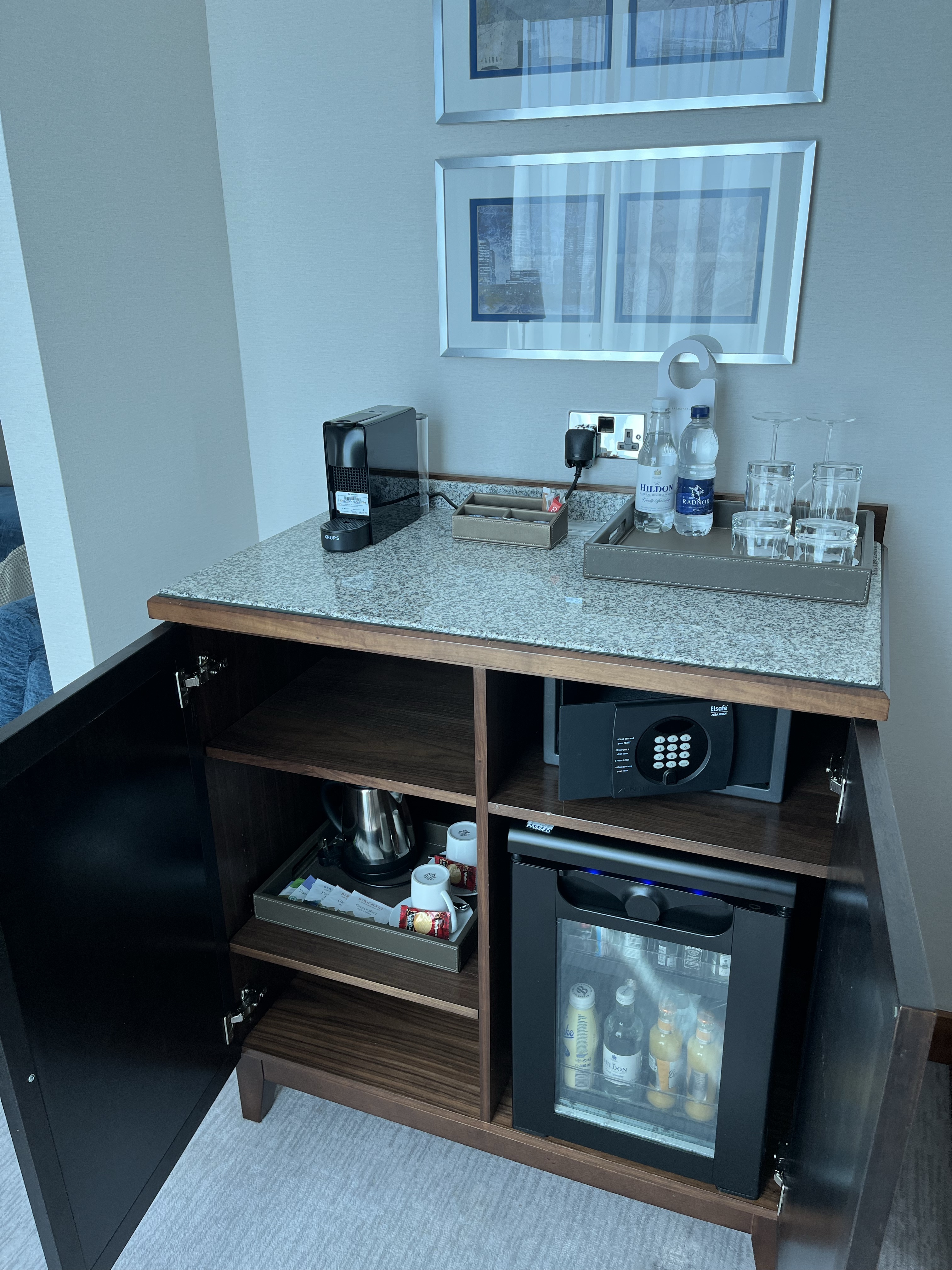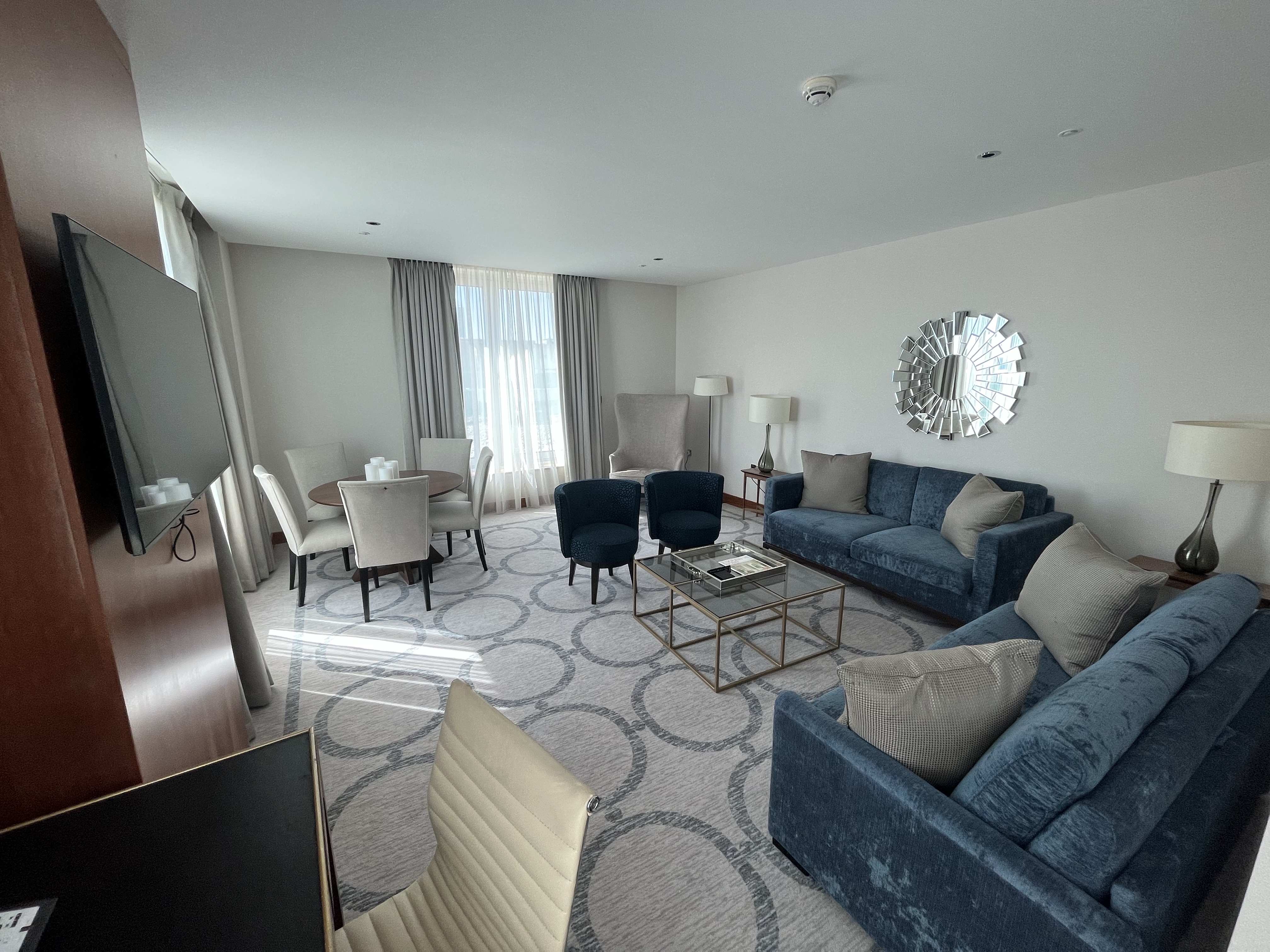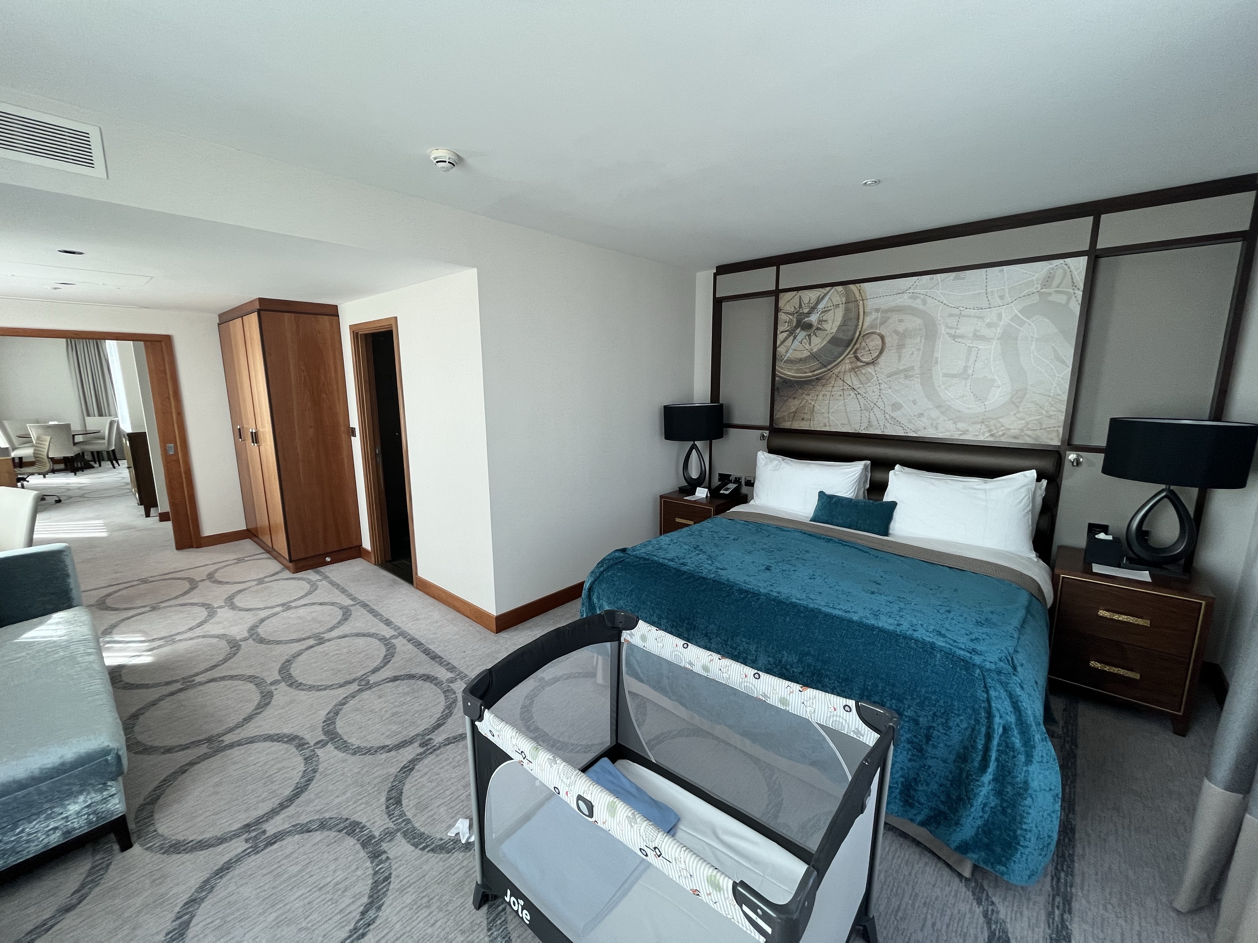 We had to wait a little while to check in, and after a bit of negotiation, we turned our basic free night into a one-bedroom king suite with lounge access for £100. The first room we went to was not a one-bedroom suite, so we duly trotted back to reception to get it sorted. The check-in team was apologetic and took our bags while we went shopping.